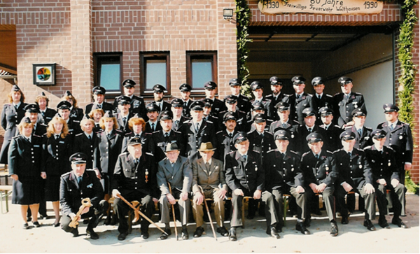 Über 400 Gäste versammelten sich am Sonnabend, den 19. Mai 1990 „rund um Wolthausen“ – und später „rund um das Gerätehaus“. Das waren beinahe mehr Menschen, als das Dorf Einwohner hatte. Der Anlaß: Die Freiwillige Feuerwehr Wolthausen blickte in diesem Jahr auf ihr 60-jähriges Bestehen zurück und hatte zu diesem Jubiläum einen Leistungsmarsch organisiert. 31 Gruppen mit jeweils neun Teilnehmern waren ab 7.50 Uhr an den Start der rund 12 Kilometer langen Strecke gegangen. Marschiert wurde in Dienstkleidung – gut dreieinhalb Stunden lang. 14 verschiedene Stationen mussten angelaufen werden und die dort gestellten Aufgaben gelöst werden.